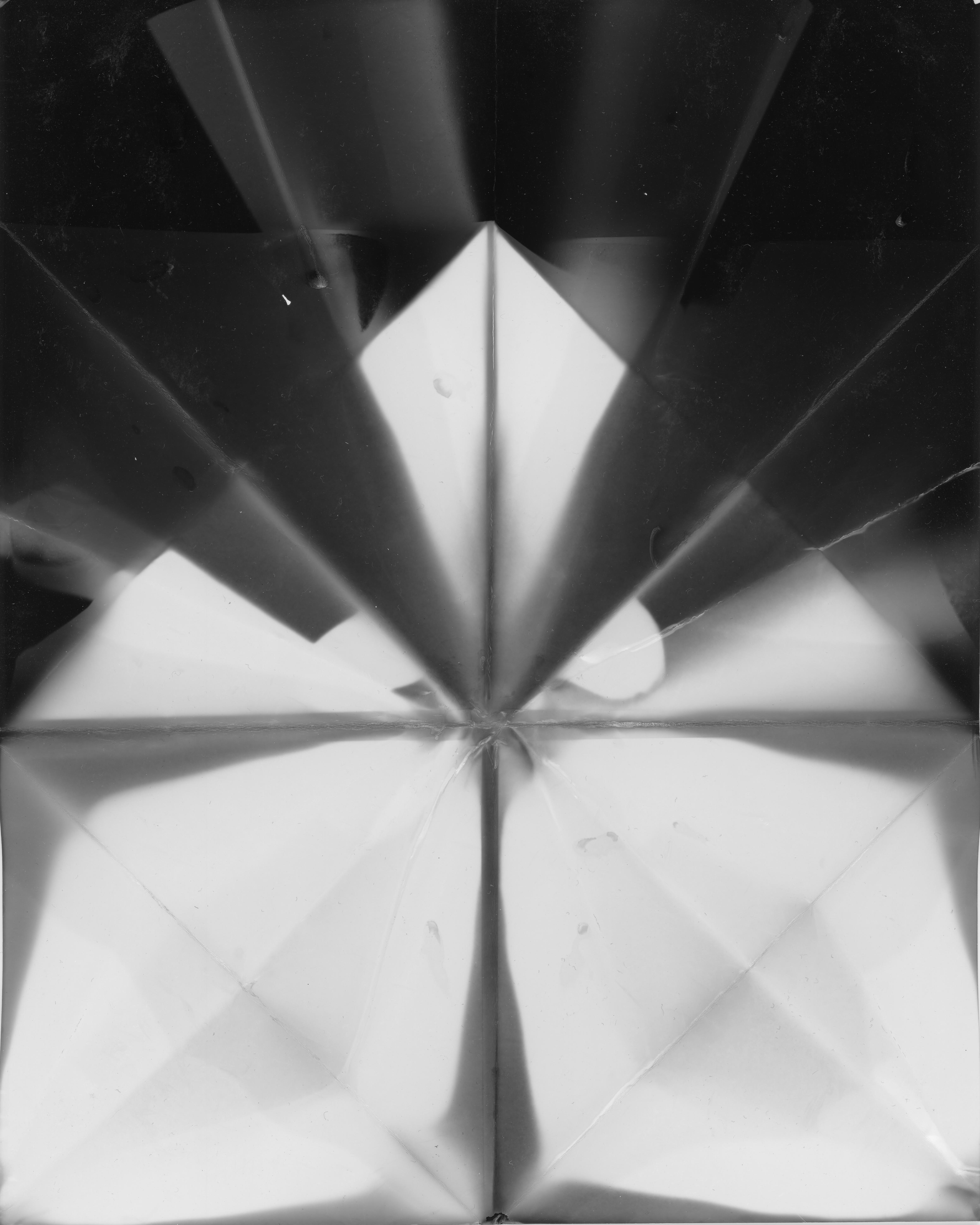 Activating memories through movement, Khim Mata Hipol folds migrant rituals into Eroplanong Papel at Bangkang Papel (Paper Airplane and Paper Boat), evoking the childhood innocence of paper airplanes and boats. Each photogram is carefully folded and exposed to light for five seconds – a symbolic gesture reflecting the five-year journey toward obtaining Canadian citizenship. The resulting gradients of glow and shadow evoke abstract, shifting landscapes that develop into emotional terrains of migration and belonging.